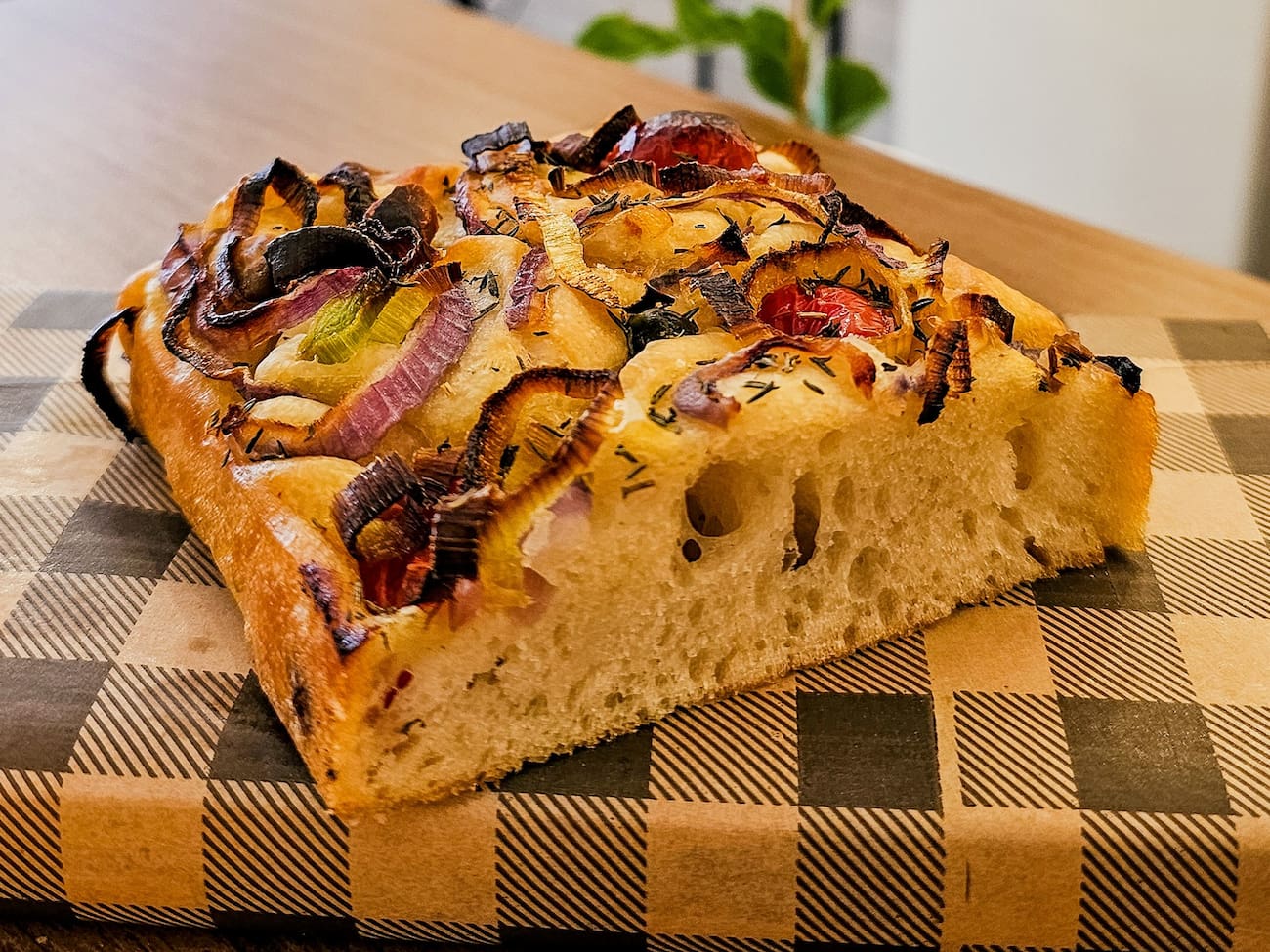 Feita com bastante azeite e coberta com cebola roxa, tomate cereja, alho-poró, tomilho e pistache.
