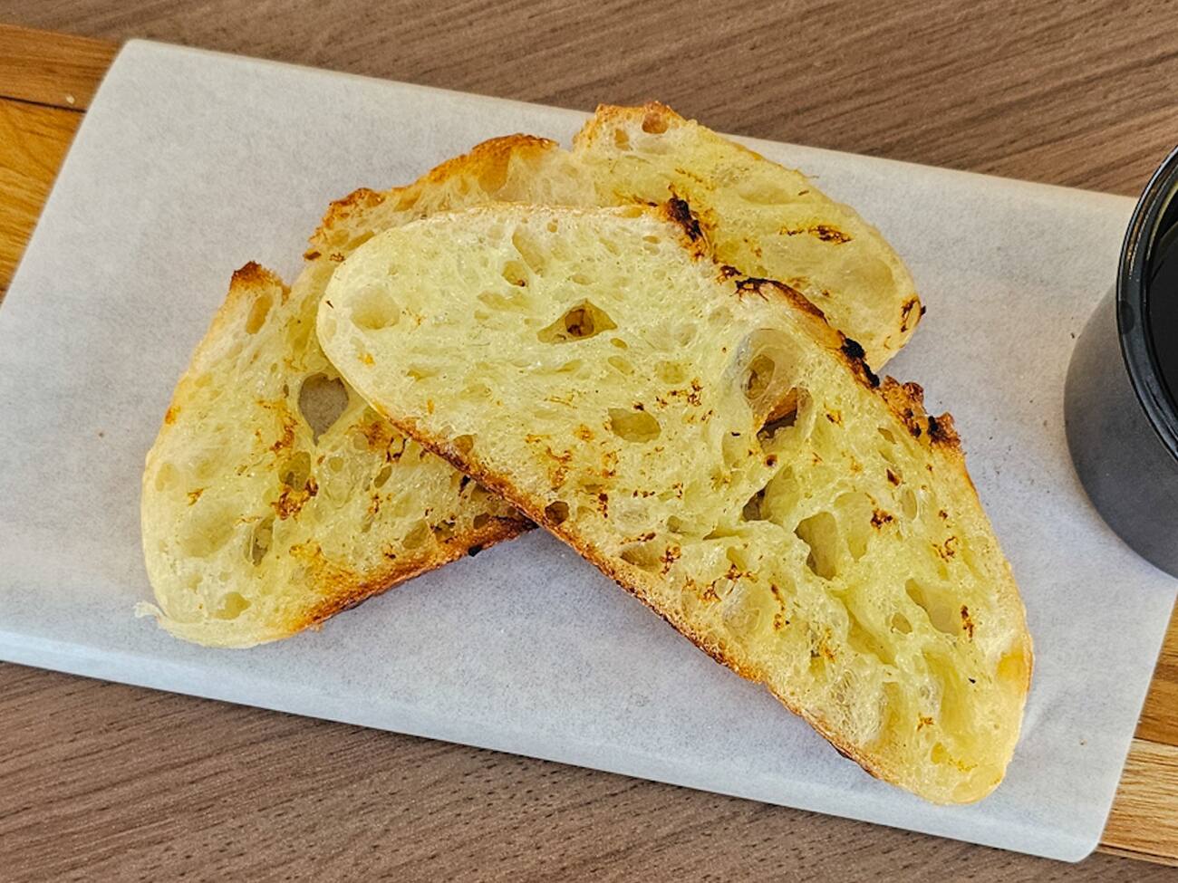 Duas fatias de pão italiano de fermentação natural com manteiga de macadâmia.